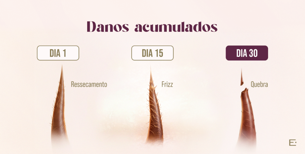 Esse contato repetitivo desgasta a cutícula, deixando o cabelo mais sensível, poroso e propenso à quebra.
