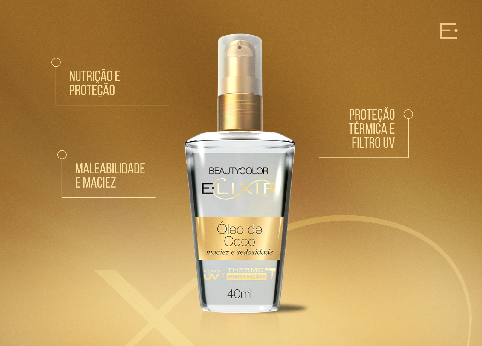 O E.lixir Óleo de Coco foi criado para proporcionar maciez e sedosidade imediatas aos fios. Sua fórmula é enriquecida com Vitamina E e ativos condicionantes, que ajudam a hidratar e nutrir profundamente os cabelos, deixando-os mais suaves, alinhados e luminosos.