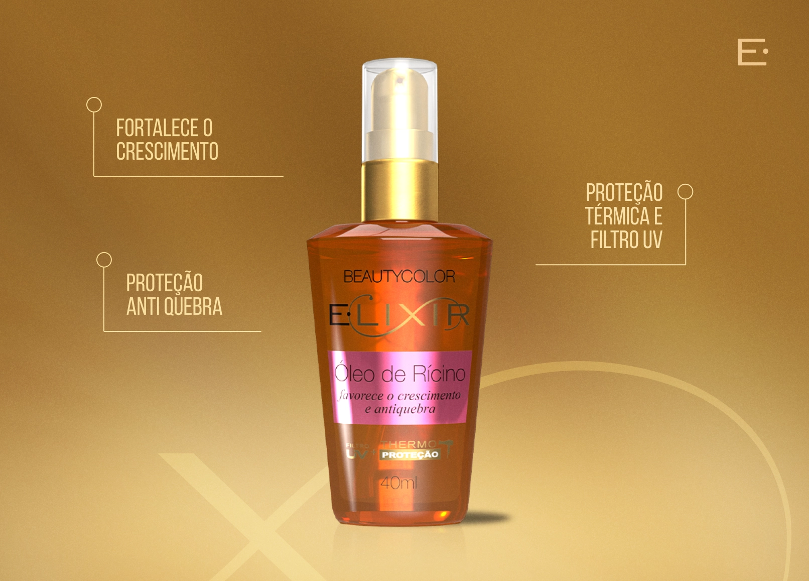 O E.lixir Óleo de Rícino é um poderoso tratamento condicionante que promove proteção antiquebra e auxilia no crescimento saudável dos cabelos. Enriquecido com Vitamina E e ativos condicionantes, fortalece os fios, devolve brilho e mantém a leveza e o movimento natural.
