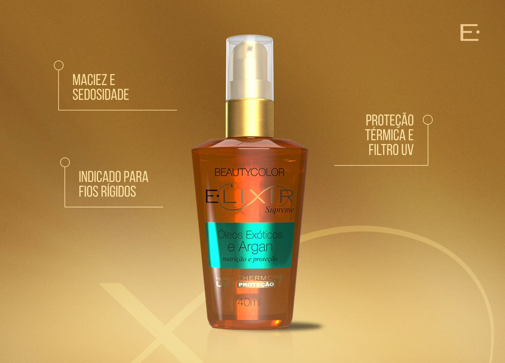 O E.lixir Óleos Exóticos e Argan é um tratamento condicionante desenvolvido para nutrir profundamente os fios, devolvendo maciez, maleabilidade e brilho radiante. Indicado especialmente para cabelos ressecados e opacos, sua fórmula enriquecida com Vitamina E e ativos condicionantes proporciona um toque sedoso e aparência saudável.